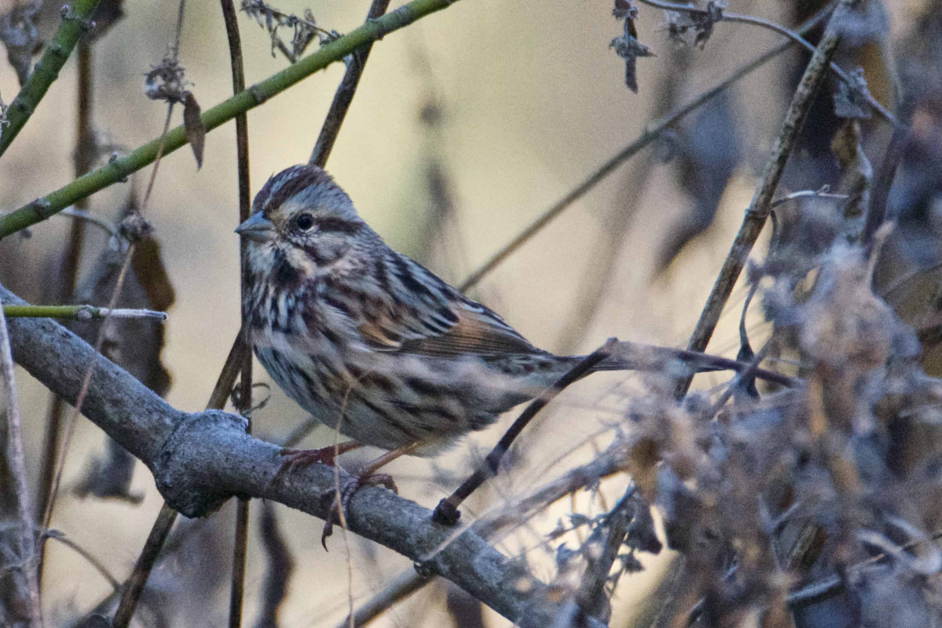 Song Sparrows are predictable in the rushes and low bushes by the creek. Their squeaky “peep” call alerts me know that they are back for the winter. The thick, dark malar stripes (the triangles on either side of the white throat) are the most distinguishing mark.