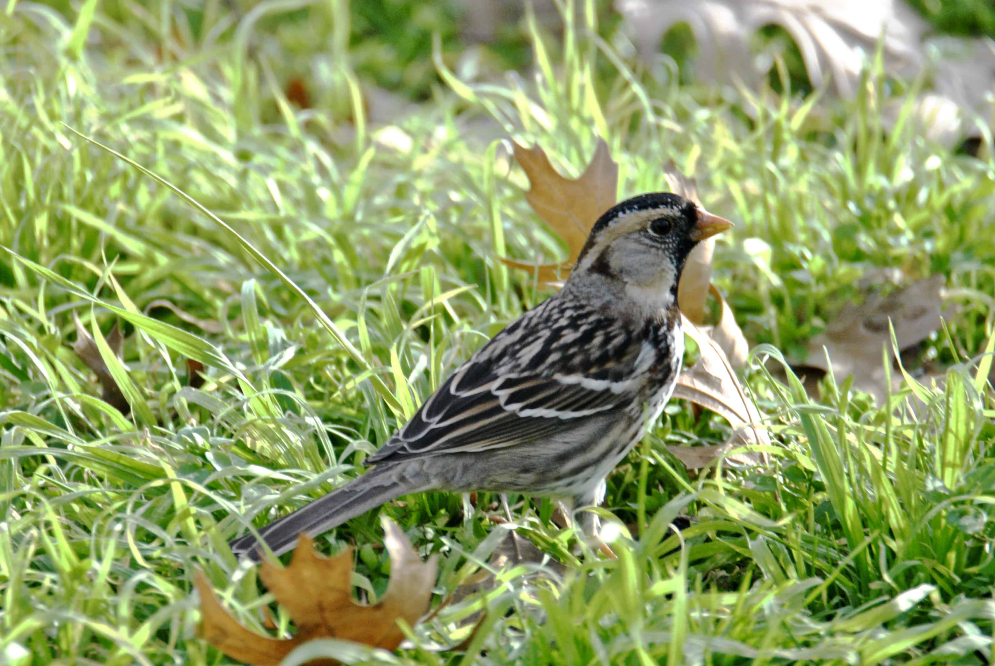 White-crowned Sparrows are less frequent visitors. They have a smaller white patch on the throat than the White-throated Sparrow.
