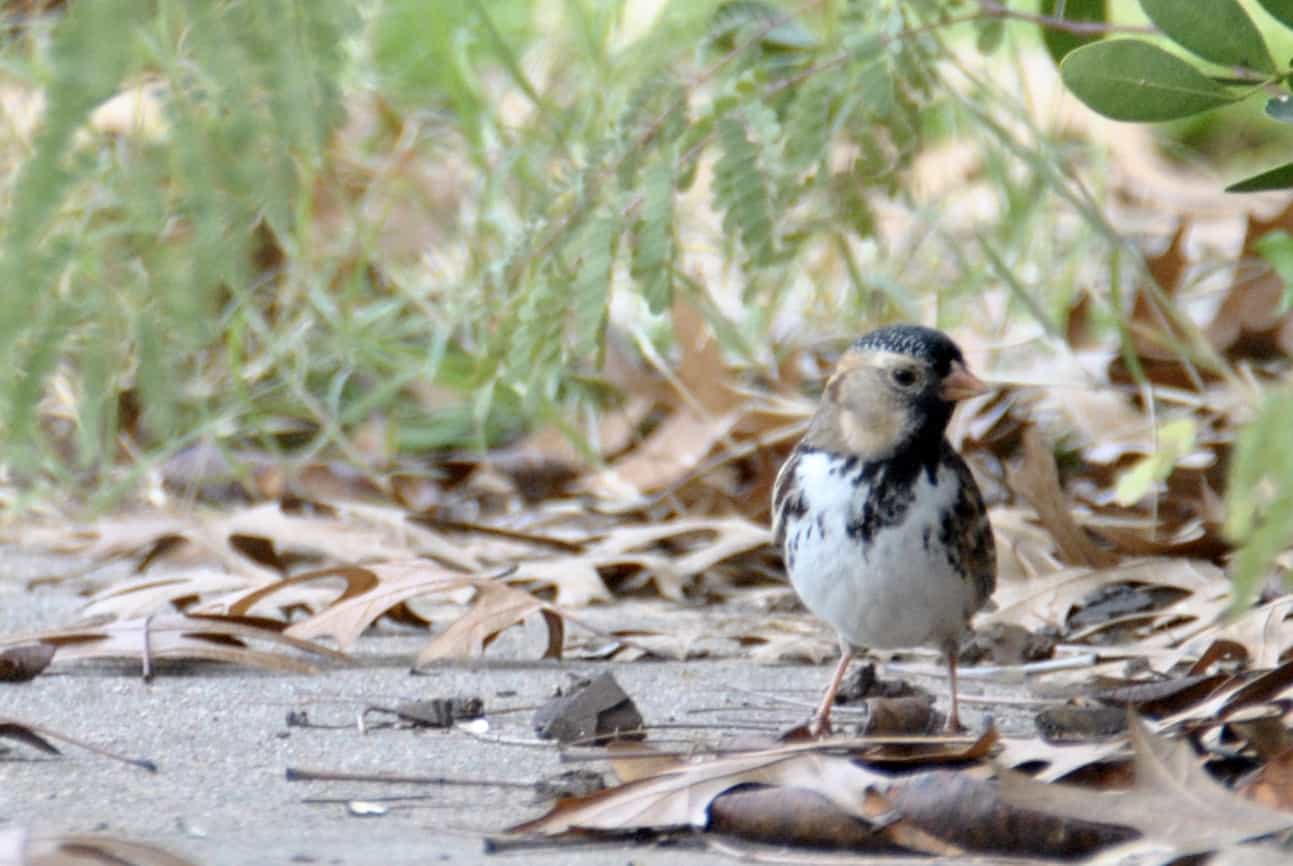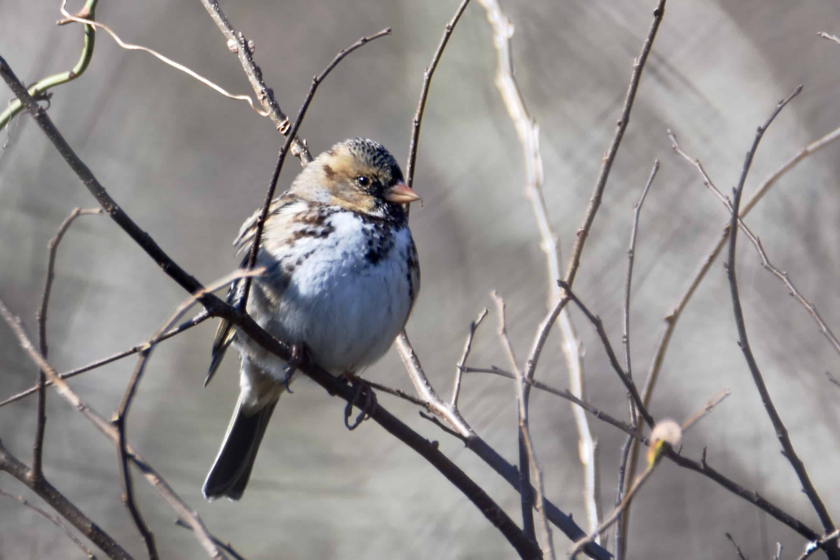 Harris’s Sparrows are large sparrows. They have distinctive, variable, black markings on their chins and breast that make me think of beards.